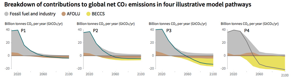 In other words, by the middle of this century, the CO2 emitted by human activities needs to be matched by the CO2 deliberately taken out of the atmosphere through negative emissions techniques, such as afforestation and bioenergy with carbon capture and storage (BECCS).