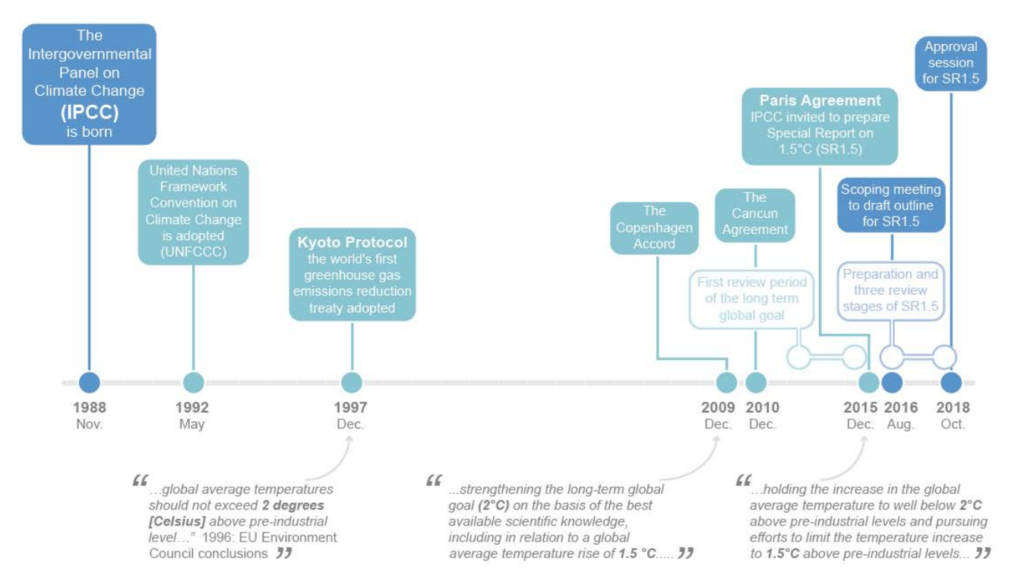 A timeline of notable dates in preparing the 1.5C special report (shaded blue) embedded within processes and milestones of the UNFCCC (grey). Credit: IPCC (pdf)